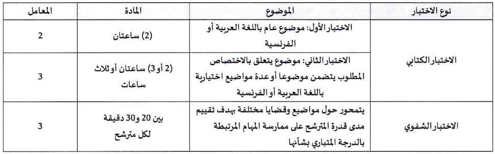 – تشمل المباراة اختبارين كتابيين واختبار شفهي كما هو منين في الجدول الاتي.