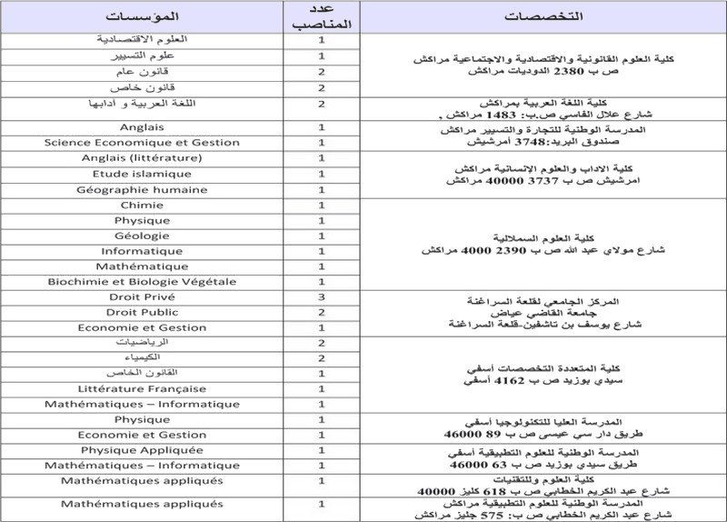 تعلن جامعة القاضي عياض يوم 15 ماي 2019 عن مباراة توظيف لفائدة المباريات في الموظفين الحاصلين على شهادة الدكتوراه أو دكتوراه الدولة أو أية شهادة أخرى معترف بمعادلتها لإحداهما وتشمل هذه المباراة 38 منصب أستاذ التعليم العالي مساعد سلم 11 في التخصصات التالية: